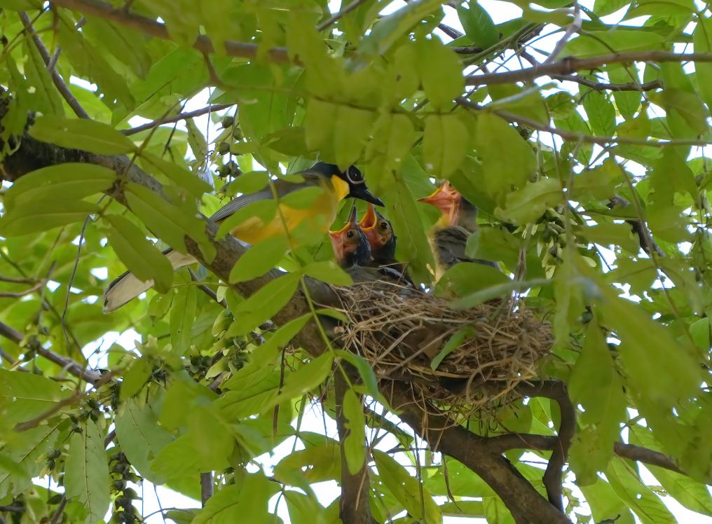 2023年6月28日,石門(mén)村內,三只藍冠噪鹛的幼鳥(niǎo)正在向親鳥(niǎo)乞食。(胡根旺 攝)