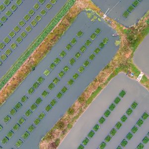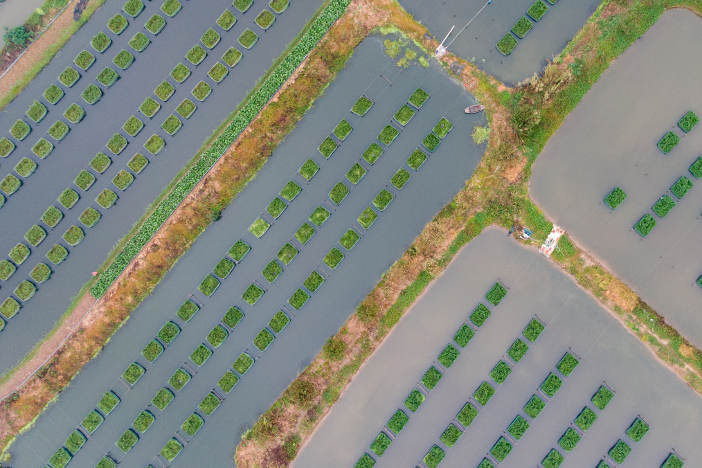 這是10月27日拍攝的湖北省仙桃市張溝鎮先鋒村的黃鱔養殖網(wǎng)箱(無(wú)人機照片)。(杜子璇 攝)