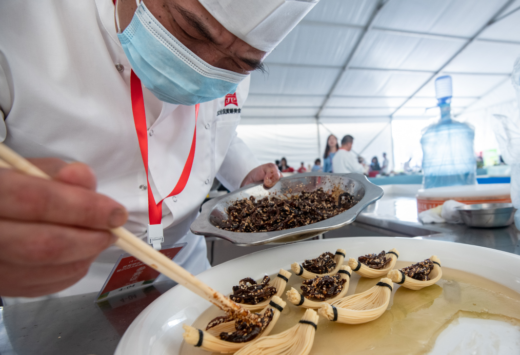 10月28日,在首屆湖北(仙桃)黃鱔節暨2023全國黃鱔美食邀請賽上,參賽廚師在擺放菜品“脆鱔乘舟”。(杜子璇 攝)