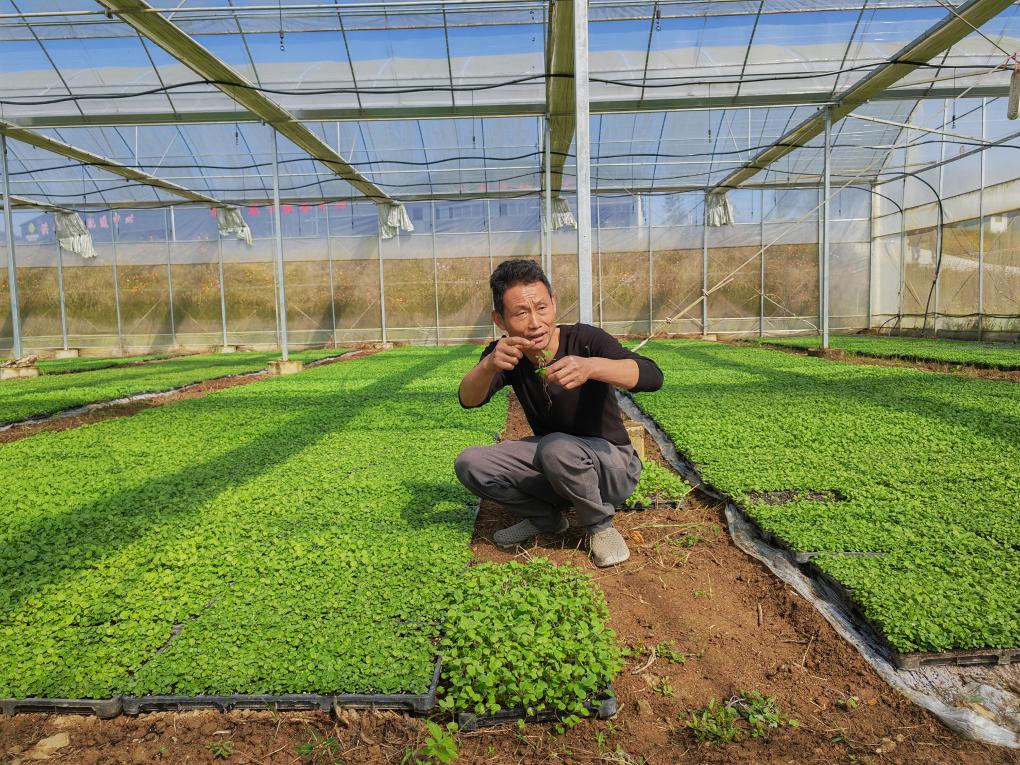 陳兆武在展示通過(guò)大棚培育的油菜苗。新華社記者張華迎 攝