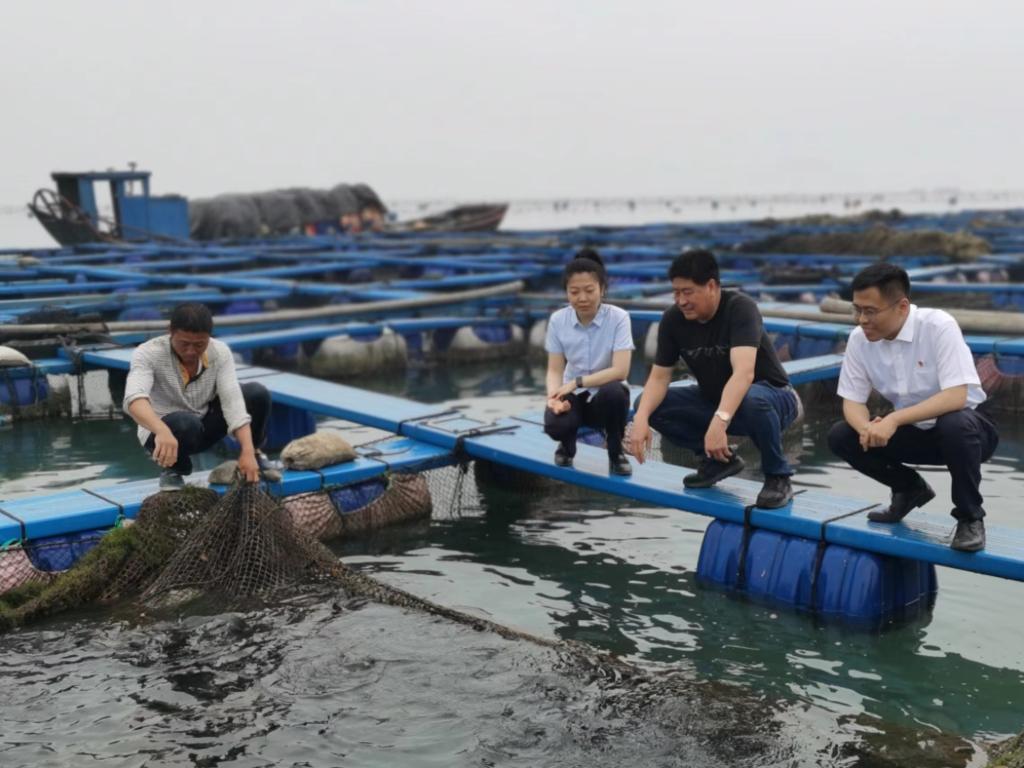 銀行工作人員在漁排上了解企業(yè)養殖情況。新華社記者秦宏 攝