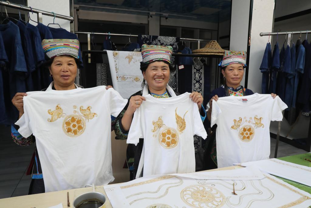 9月1日,苗族婦女姜老本(中)展示她和村民用蠟筆在T恤上畫(huà)的“村超”足球。(李長(cháng)華 攝)