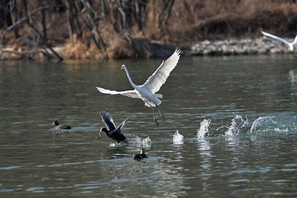 在山西省太原市,鳥(niǎo)兒在汾河嬉戲(2023年1月4日攝)。新華社記者 楊晨光 攝