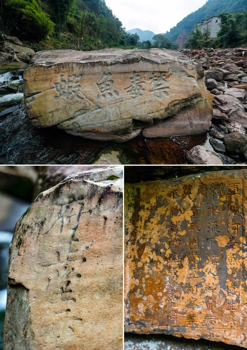 初冬時(shí)節的赤水支流桂花河水流平緩,順著(zhù)水稻田坎下到岸邊,一塊鐫刻著(zhù)“禁毒魚(yú)蝦”四個(gè)正楷大字的巨石立于河畔,左上角款識題作“府正堂示”?!罢谩?,是清代主官的代稱(chēng)。這樣的碑刻在黃荊鎮還有兩處?!把睾佣爵~(yú)大傷生命,水流下游人飲亦病?!睒闼氐奈淖值莱隽它S荊老林先民們的“環(huán)保意識”。