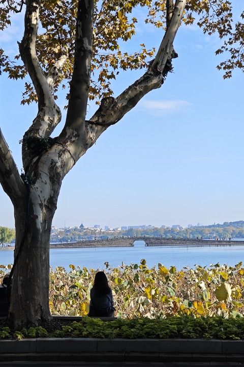 11月22日,西湖北山街,一位游客坐在湖邊欣賞秋日斷橋。新華社記者 黃宗治 攝