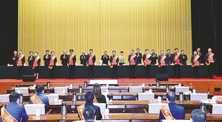 在自治區“擔當作為好干部”命名大會(huì )上,出席大會(huì )的自治區領(lǐng)導為“擔當作為好干部”代表頒發(fā)獎?wù)潞妥C書(shū)。