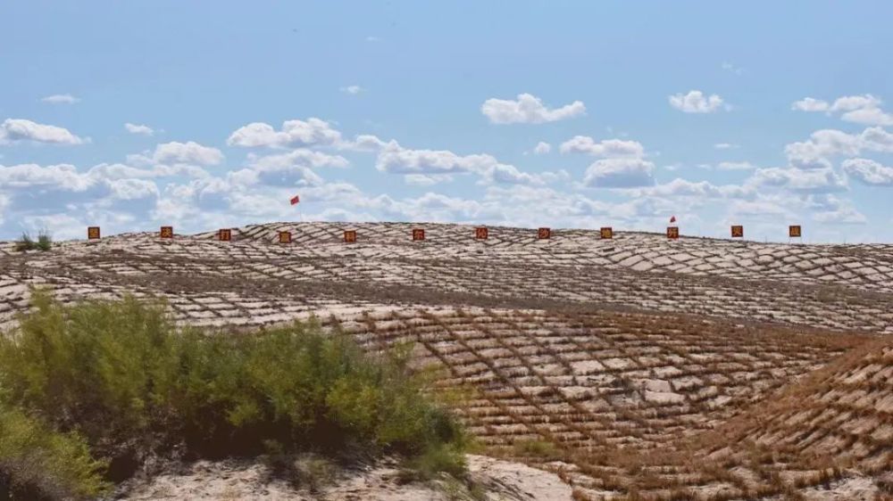 為防止烏蘭布和與巴音溫都爾兩大沙漠“握手”,巴彥淖爾市烏拉特后旗探索出“工程固沙+造封飛”系統治理模式,由沙柳、稻草、蘆草等10種材料做成的各式沙障鋪展在沙地上,構成一道獨特的風(fēng)景。
