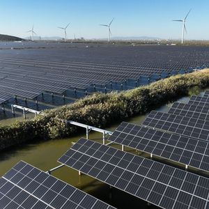 這是位于江蘇連云港市灌云縣圩豐鎮洋橋村的漁光互補發(fā)電項目(無(wú)人機照片,2023年11月17日攝)。新華社記者 季春鵬 攝