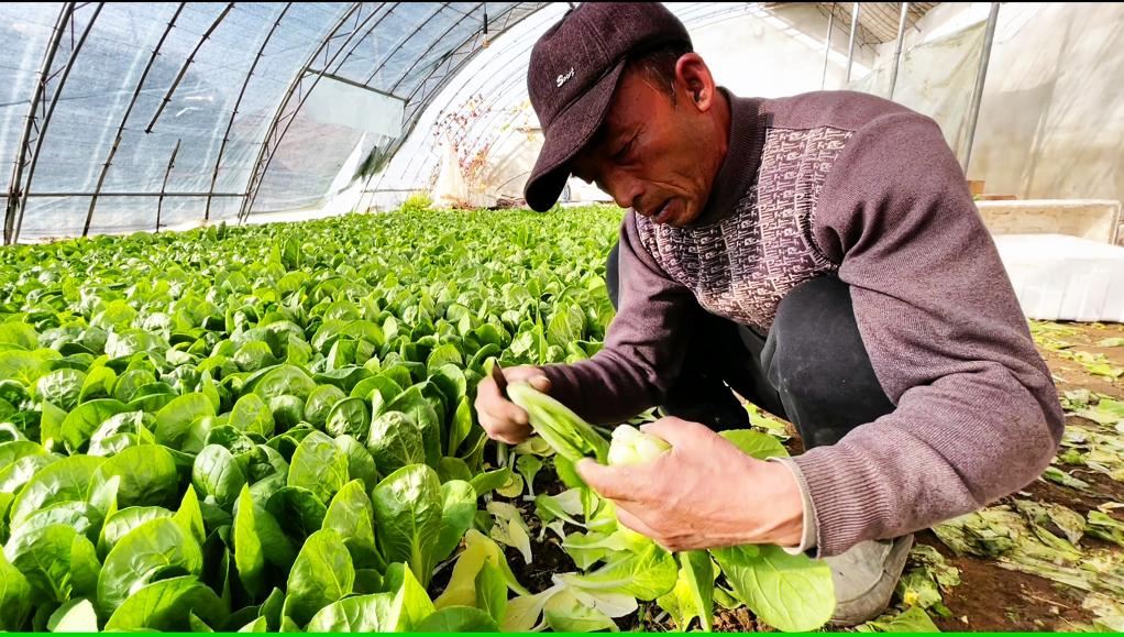 在他的溫室大棚里,水肥一體化裝備可實(shí)現精準灌溉、施肥,數字化監測設備能及時(shí)干預棚內環(huán)境。正值蔬菜成熟期,一大片翠綠的油菜等待收割,四五個(gè)工人忙著(zhù)采摘、分揀、裝筐。