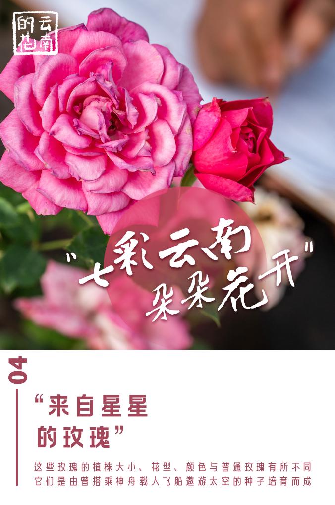 云南省安寧市現代農業(yè)園區玫瑰種植示范園里,一株株玫瑰美麗綻放。這些玫瑰的植株大小、花型、顏色與普通玫瑰有所不同。它們是由曾搭乘神舟載人飛船遨游太空的種子培育而成,因此也被稱(chēng)為“來(lái)自星星的玫瑰”。