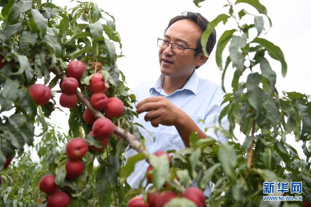 8月18日,方志利在查看桃子生長(cháng)情況。