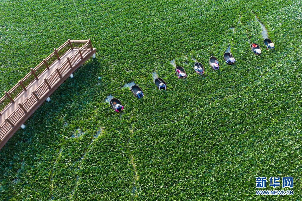 8月19日,在浙江省嘉興市秀洲區油車(chē)港鎮西千畝蕩,菱農們坐著(zhù)水鄉特有的菱桶采摘成熟的菱角(無(wú)人機照片)。