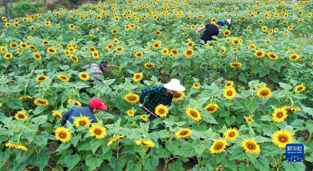 8月23日,河北省唐山遵化市建明鎮鴻鴨屯村的農民在向日葵田間鋤草(無(wú)人機照片)。