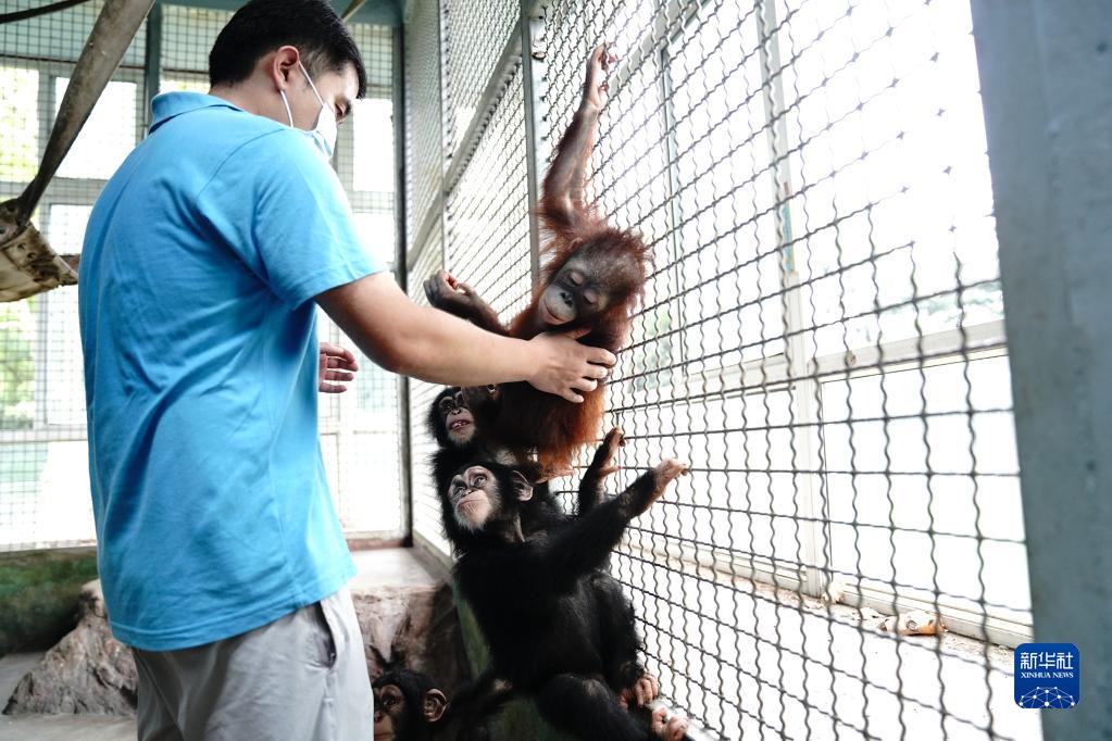 8月28日,保育員讓“黑妞”和黑猩猩小伙伴們一起玩耍。新華社記者 張建松 攝