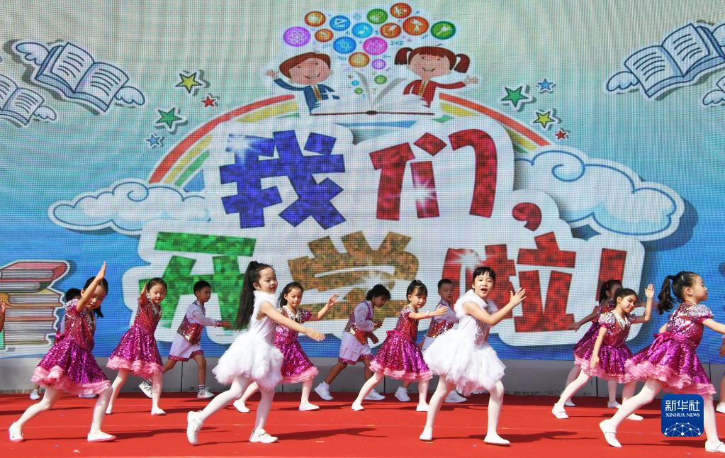 9月1日,在北京市海淀區太平路小學(xué),學(xué)生在開(kāi)學(xué)典禮中表演節目。