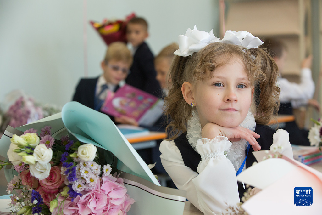 9月1日,學(xué)生們在俄羅斯圣彼得堡一所學(xué)校內等待上課。
