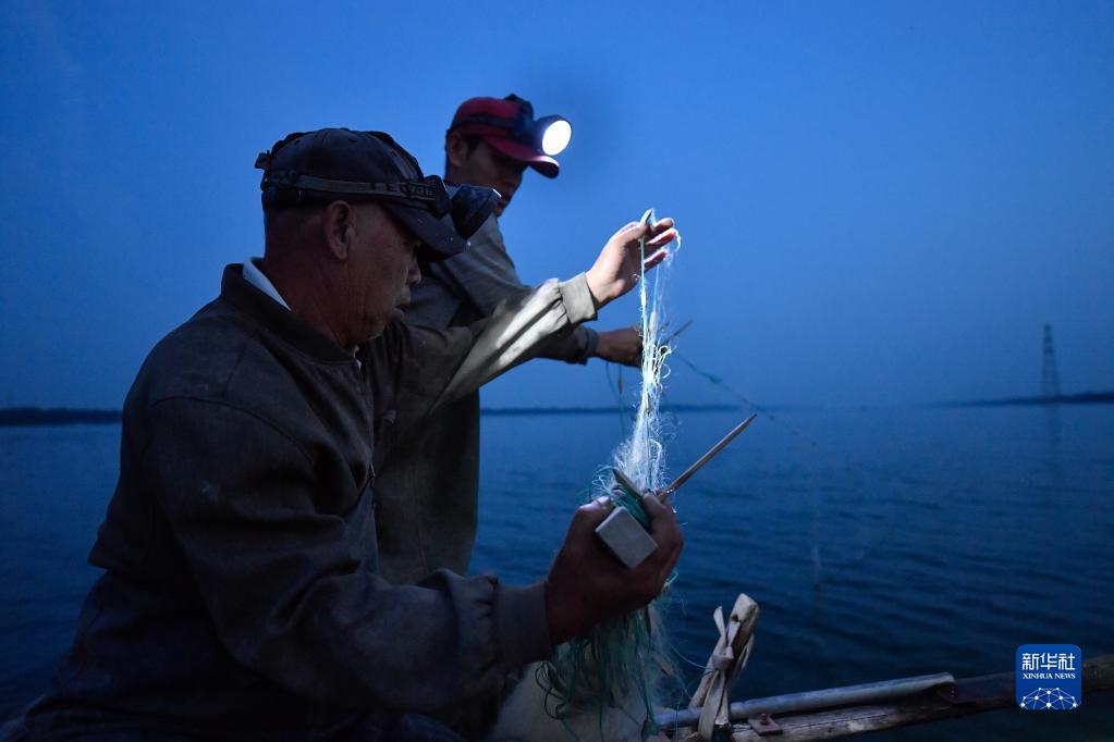 清晨,小辛碼頭村村民在潮白河上整理漁網(wǎng)準備捕魚(yú)(9月3日攝)。新華社記者 孫凡越 攝