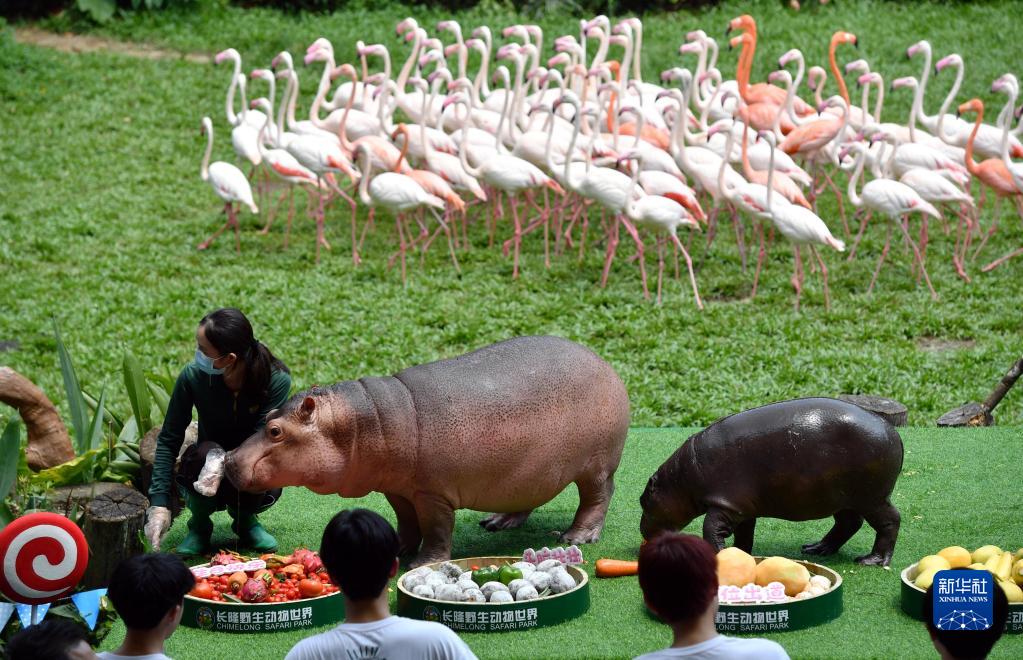9月9日,廣州長(cháng)隆野生動(dòng)物世界的河馬菲菲(左)在生日會(huì )上享受美食。