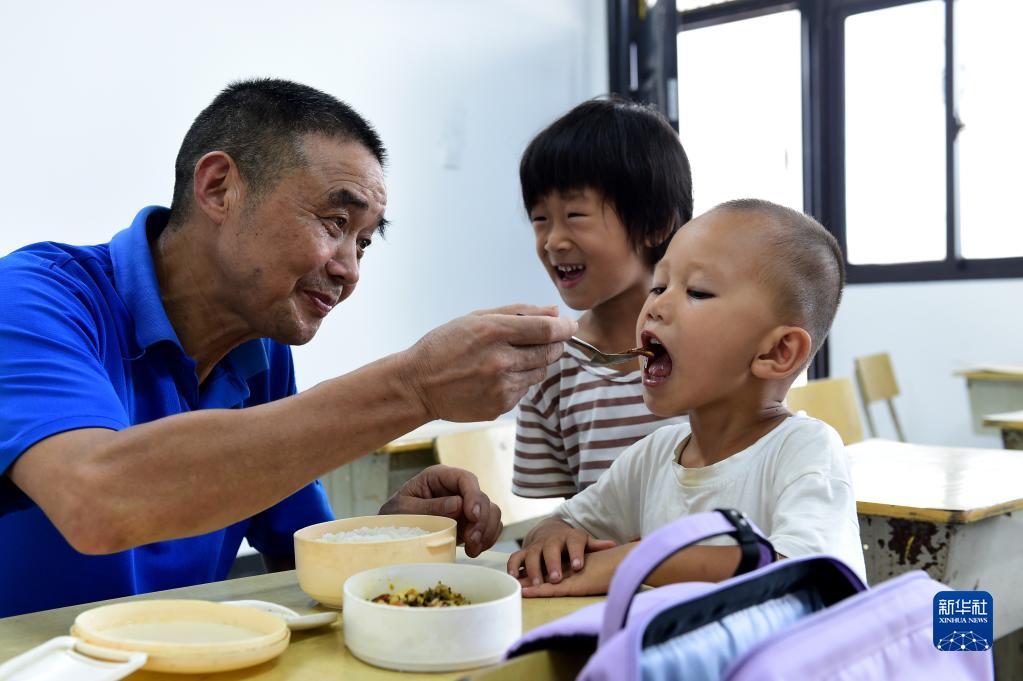 在菥荻教學(xué)點(diǎn),許新民喂學(xué)前班學(xué)生朱元浩吃午飯(9月1日攝)。