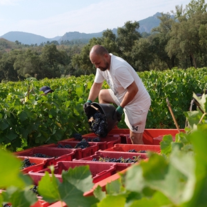 9月9日,在法國南部濱海阿爾卑斯省的芒德略拉納普勒,果農采摘用來(lái)釀酒的葡萄。