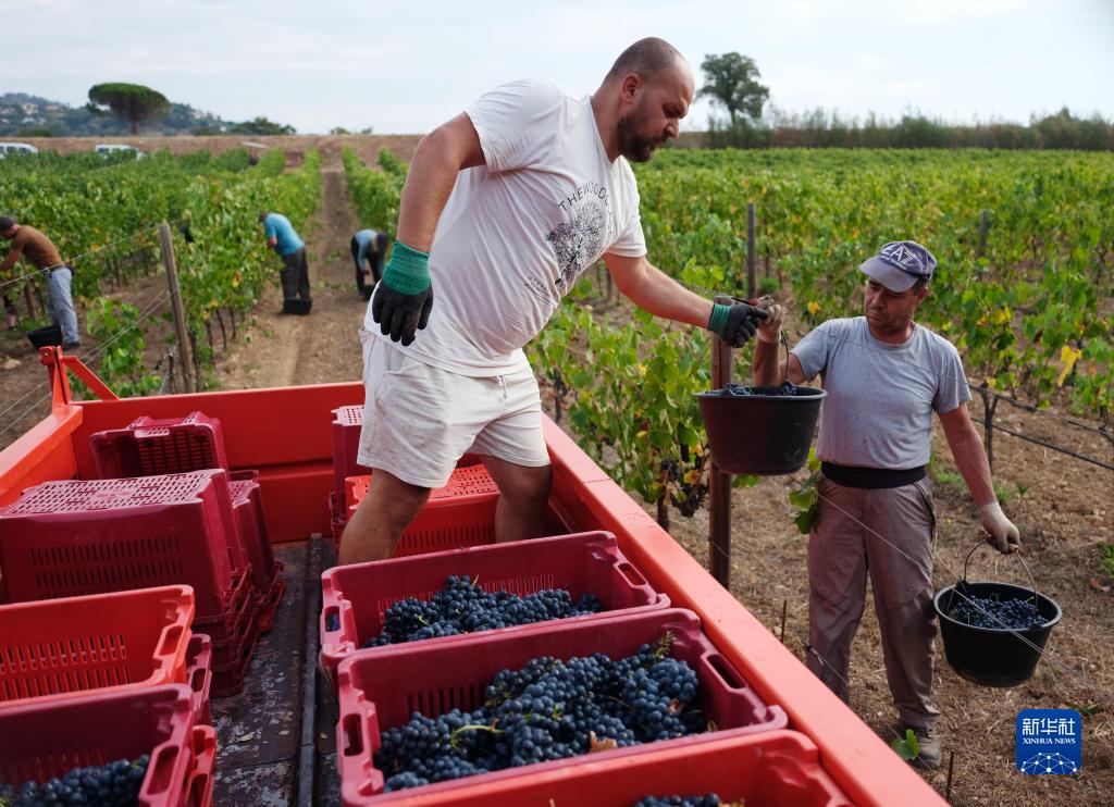 9月9日,在法國南部濱海阿爾卑斯省的芒德略拉納普勒,果農采摘用來(lái)釀酒的葡萄。