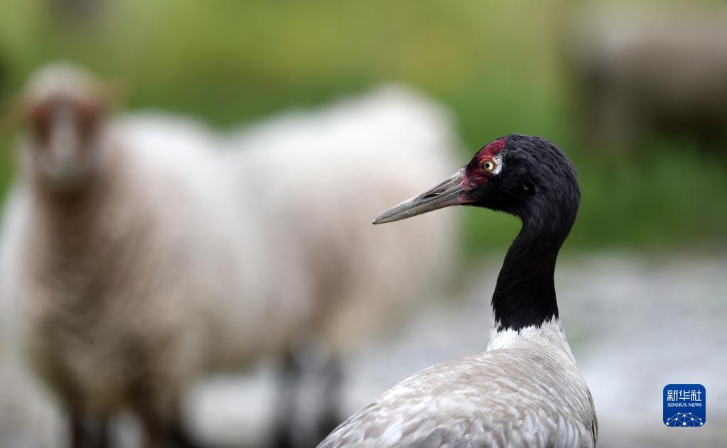 在西藏日喀則市扎什倫布寺院內,一只黑頸鶴與一群放生羊生活在一起,和睦相處。這只黑頸鶴曾因受傷無(wú)法遷徙,被附近的村民送到寺廟院里。如今,黑頸鶴儼然成了羊群的“頭羊”,被當地人稱(chēng)為“牧羊的鶴”。