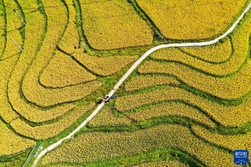 連日來(lái),貴州省黔南布依族苗族自治州龍里縣灣灘河鎮天氣晴好。水稻成熟,田野鍍金,農民搶收稻谷,一片豐收景象。