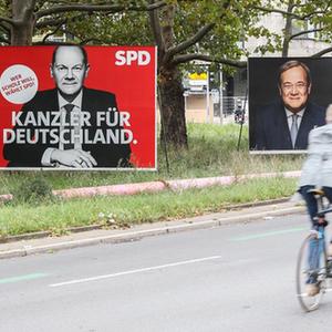9月25日,在德國首都柏林,一名騎行者經(jīng)過(guò)(從左至右)綠黨總理候選人貝爾伯克、社民黨總理候選人肖爾茨、聯(lián)盟黨總理候選人拉舍特的競選海報。