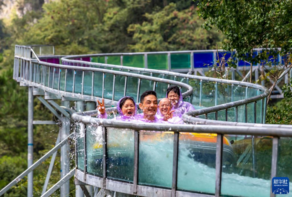 10月2日,游客在貴陽(yáng)市開(kāi)陽(yáng)縣南江大峽谷景區體驗玻璃滑道。