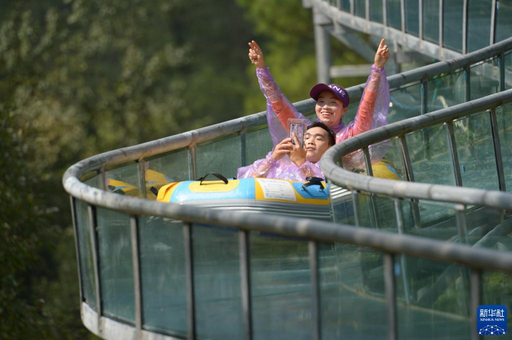 10月2日,在貴陽(yáng)市開(kāi)陽(yáng)縣南江大峽谷,游客體驗玻璃滑道。