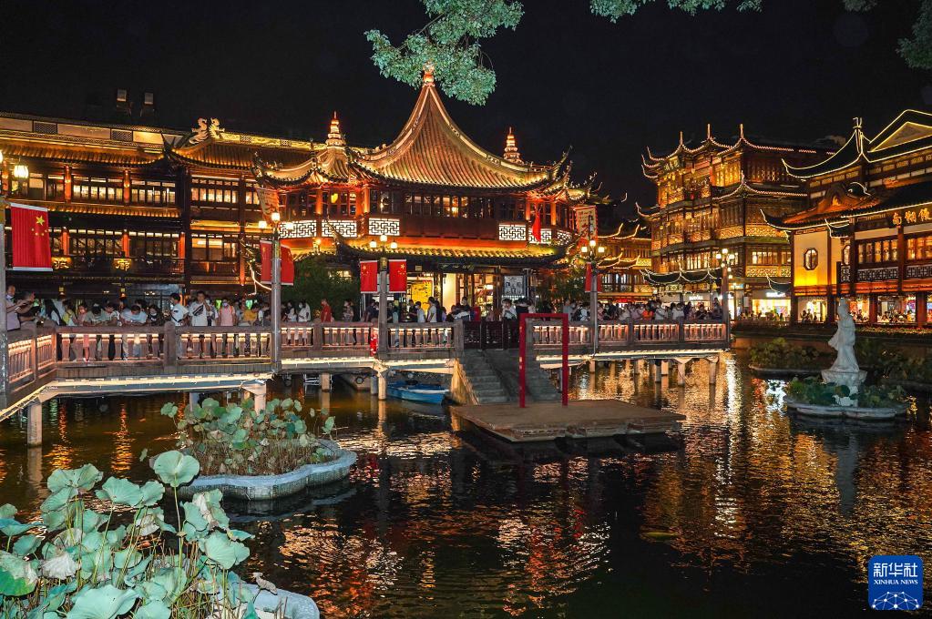 10月2日,人們在上海豫園九曲橋上游玩。