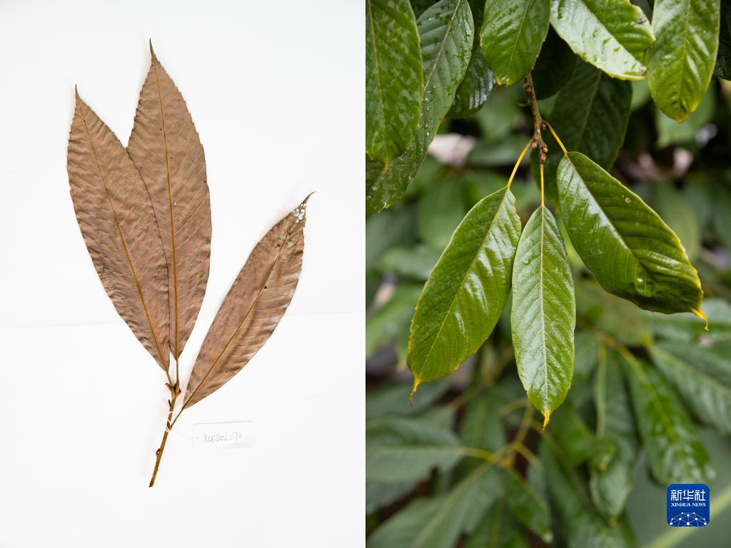 這是10月10日在昆明植物園拍攝的西疇青岡。這張拼版照片分別為科研人員野外采集的標本(左)和在植物園遷地保護后存活下來(lái)的同種植物。