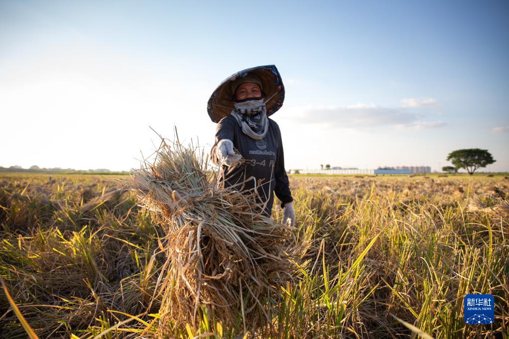10月25日,農民在老撾萬(wàn)象城邊的田地里收割稻谷。