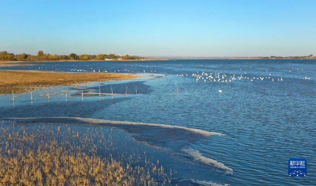 河口水庫濕地聚集著(zhù)大批白天鵝(10月31日攝,無(wú)人機照片)。