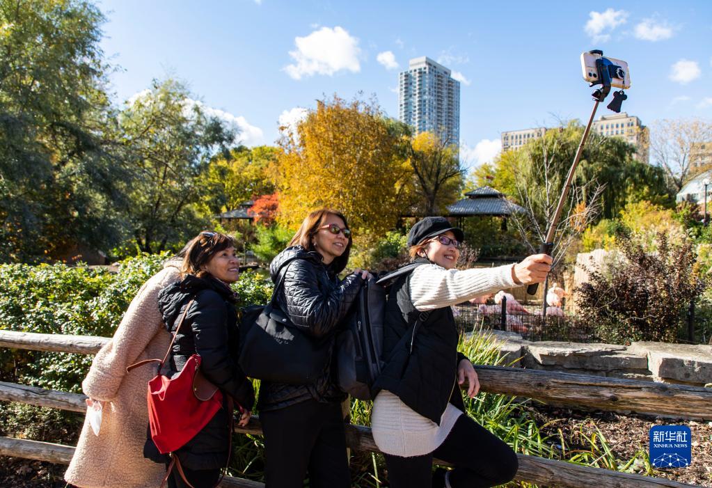 11月2日,游人在美國芝加哥林肯公園動(dòng)物園自拍。