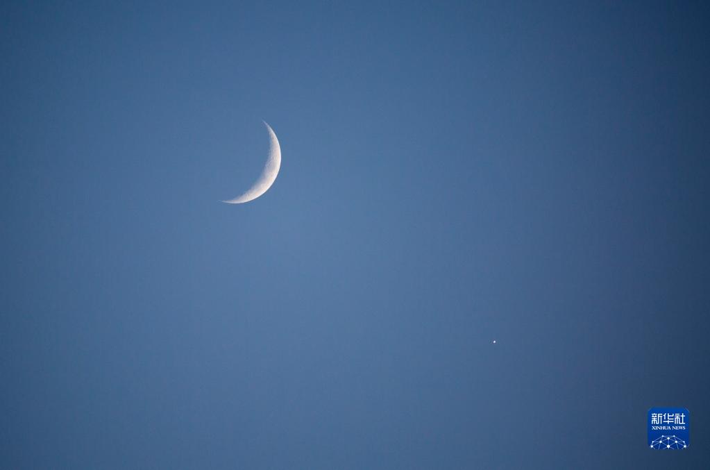 11月8日傍晚在江西省九江市都昌縣拍攝的金星合月景觀(guān),金星和月球在天空相互呼應,格外醒目。