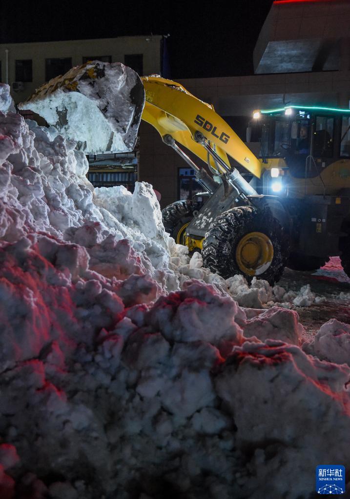 11月11日晚,在通遼市運達綠色農副產(chǎn)品批發(fā)市場(chǎng),作業(yè)車(chē)輛連夜清理積雪。