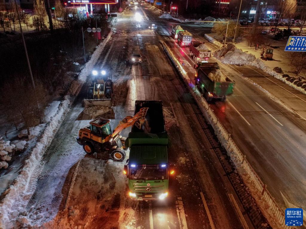 11月11日晚,在通遼市城區,作業(yè)車(chē)輛連夜清理積雪(無(wú)人機照片)。