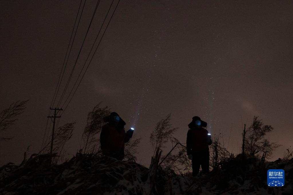 11月21日晚,國網(wǎng)雞西供電公司的工人在雪中巡查線(xiàn)路。