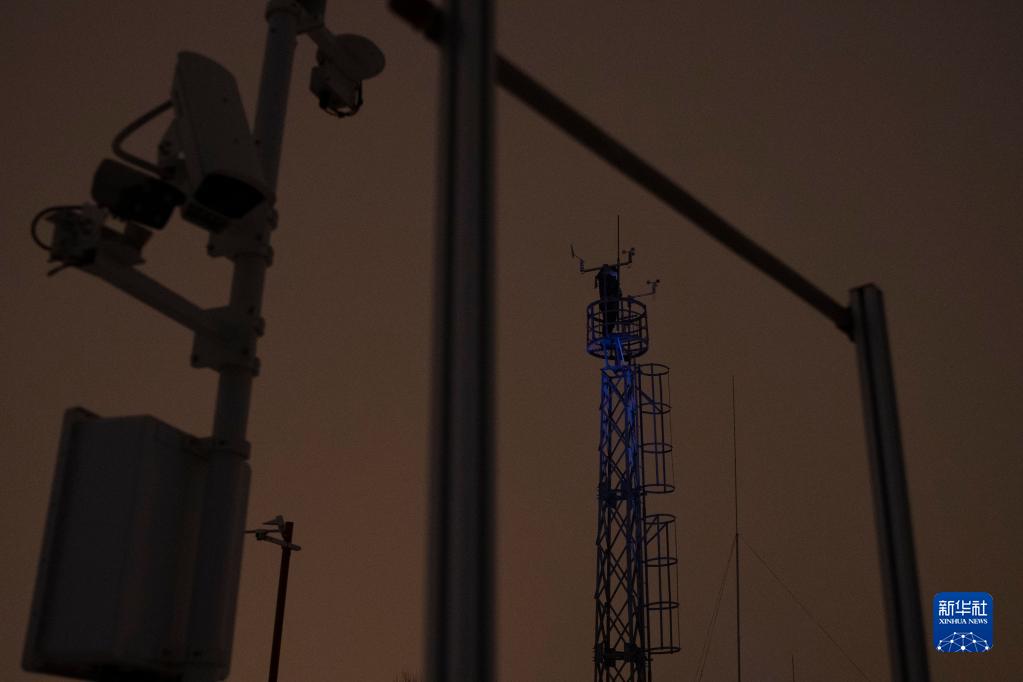 11月21日晚,在雞西市氣象局,工作人員在雪中巡查設備。