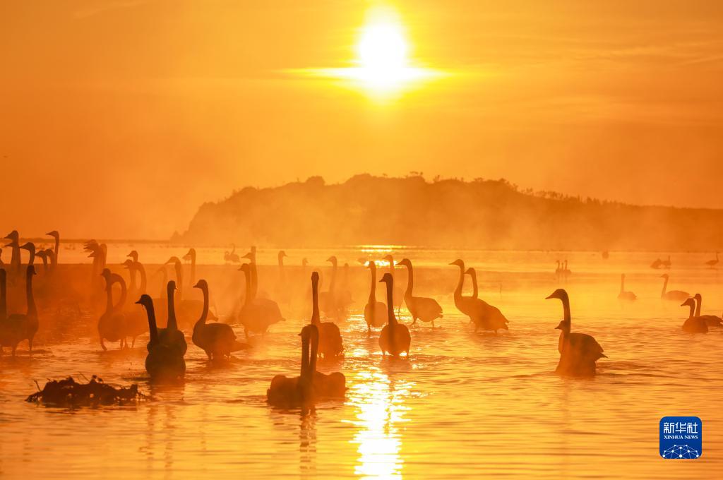 冬日清晨,山東榮成大天鵝國家級自然保護區晨霧裊裊,大天鵝在晨曦中游弋覓食、起舞飛翔,吸引眾多游客前來(lái)觀(guān)賞拍照。