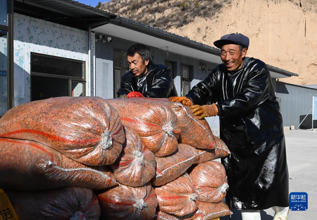 12月2日,在山西省嵐縣界河口鎮,合作社成員在搬運新鮮的沙棘果。新華社記者 柴婷 攝