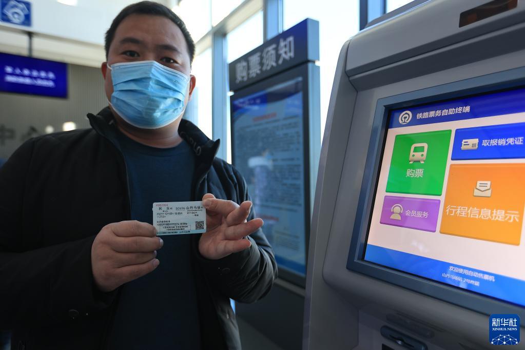 12月5日,在蘭新高鐵山丹馬場(chǎng)站購票的旅客展示車(chē)票。新華社發(fā)(王超 攝)