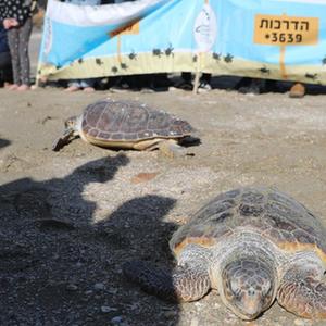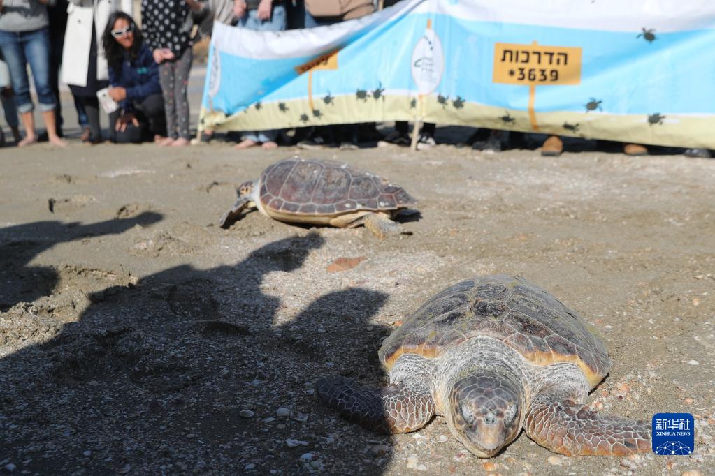 12月10日,在以色列北部城市海法附近的海灘,經(jīng)過(guò)以色列海龜救助組織治療后痊愈的海龜被放歸大海。
