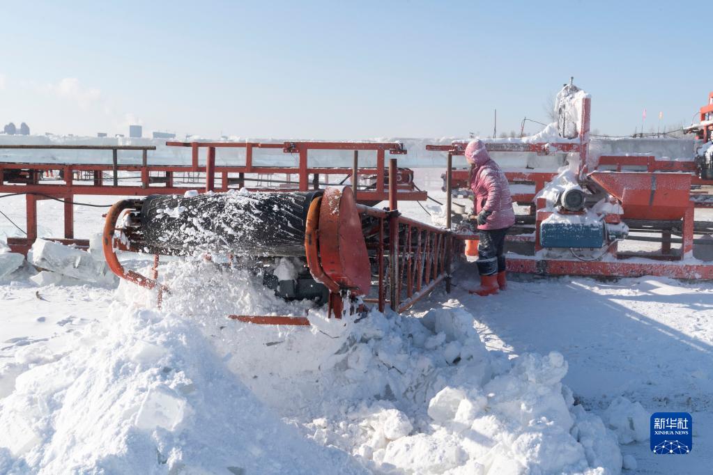 目前,黑龍江哈爾濱冰雪大世界的采冰和建設工作正加緊進(jìn)行。為保證足夠的優(yōu)質(zhì)冰供給,采冰人每天在松花江哈爾濱段封凍的江面上裁冰、采冰。