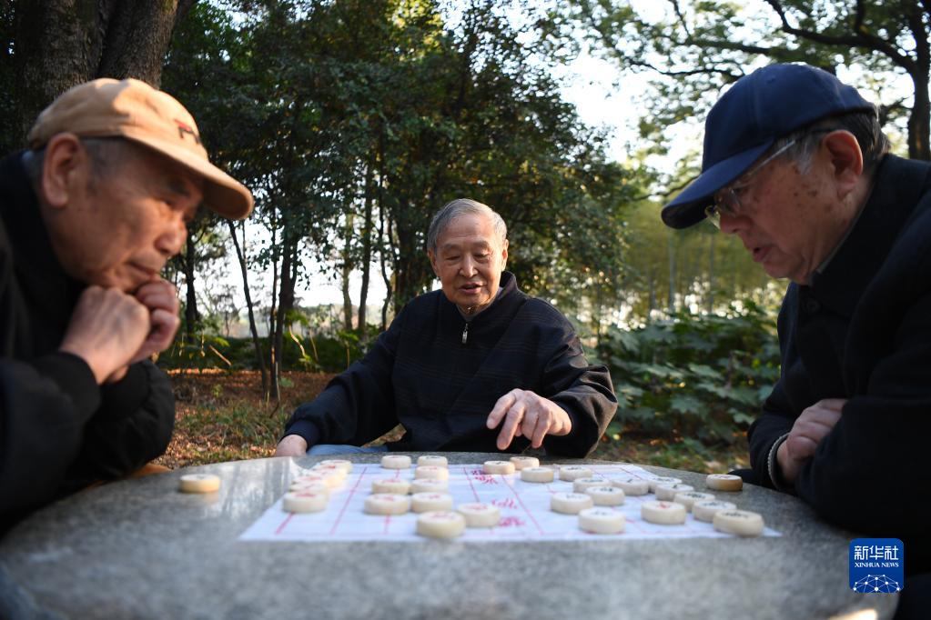 12月22日,馬利民(左)、魏鎮(右)在公園里下象棋,余國基在一旁觀(guān)戰。新華社記者 薛宇舸 攝