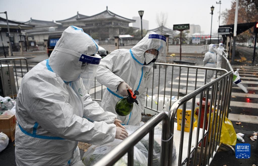 12月25日,西安市小寨東路一封控小區的工作人員將外賣(mài)配送的蔬菜進(jìn)行消毒。