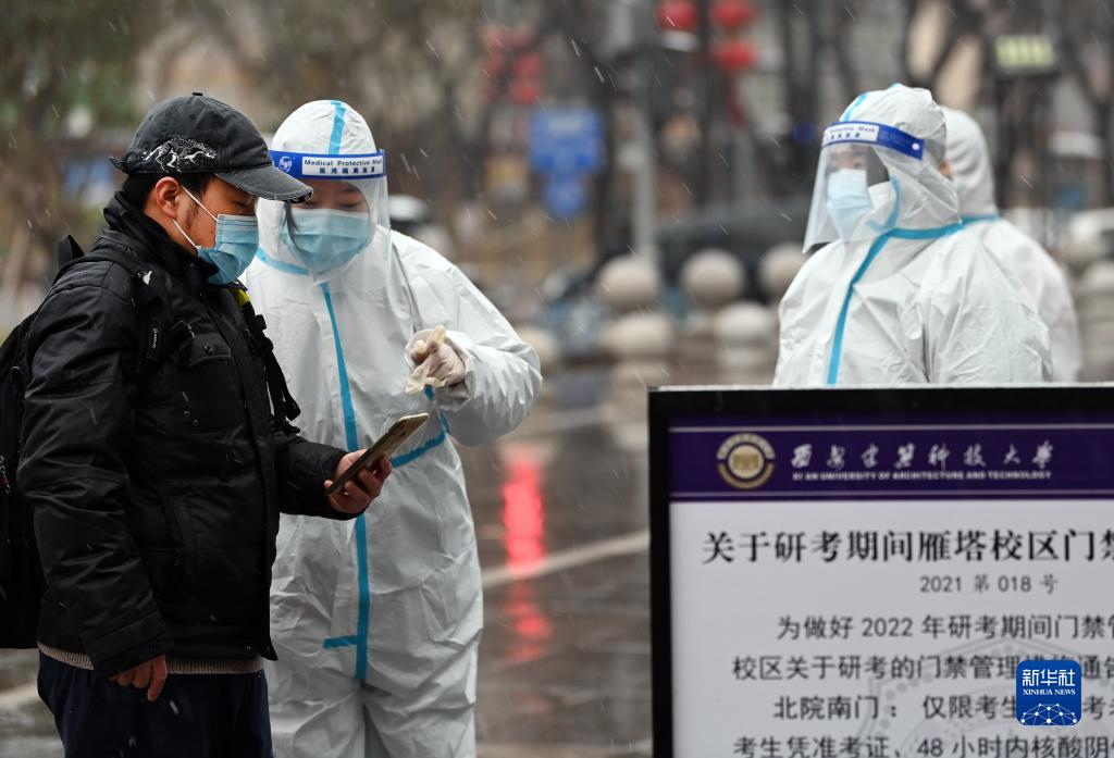 12月25日,防疫人員查看研考生(左一)的核酸檢測結果。當日在西安市參加考試的考生約13.5萬(wàn)人,他們將在各方保駕護航下,帶著(zhù)希望與夢(mèng)想奔赴各考點(diǎn)。