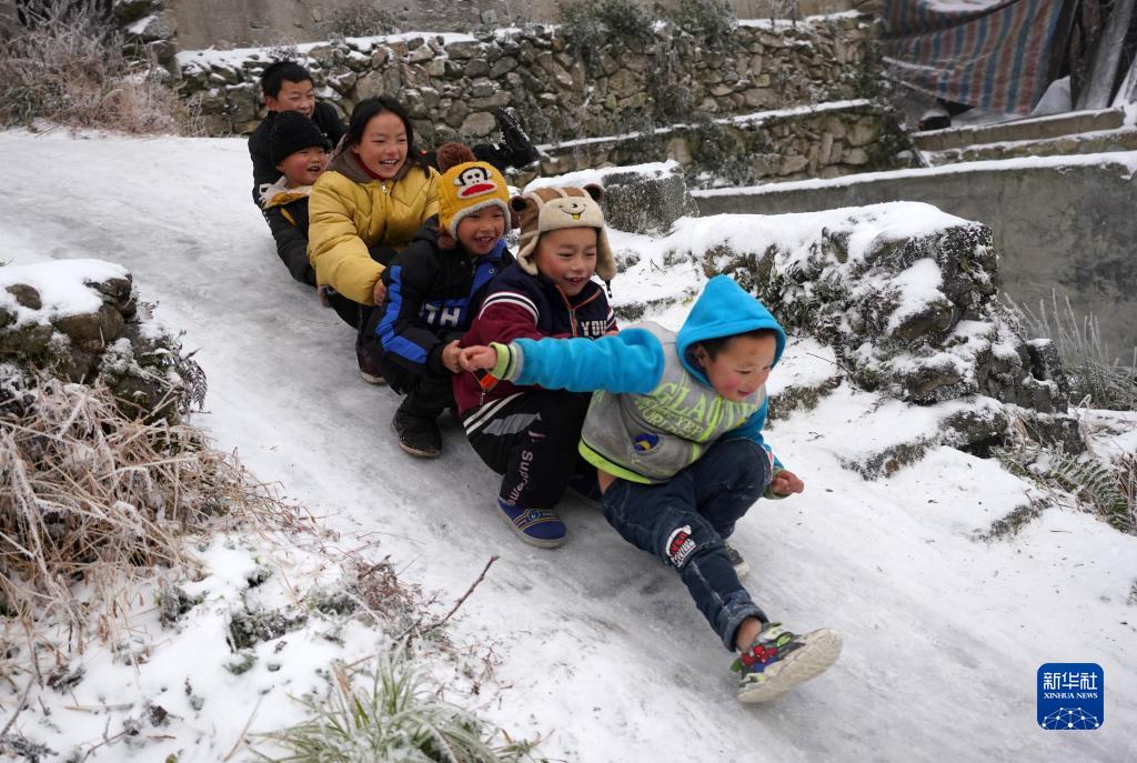 12月27日,在廣西融水苗族自治縣桿洞鄉高強苗寨,孩子們在雪地上玩耍。