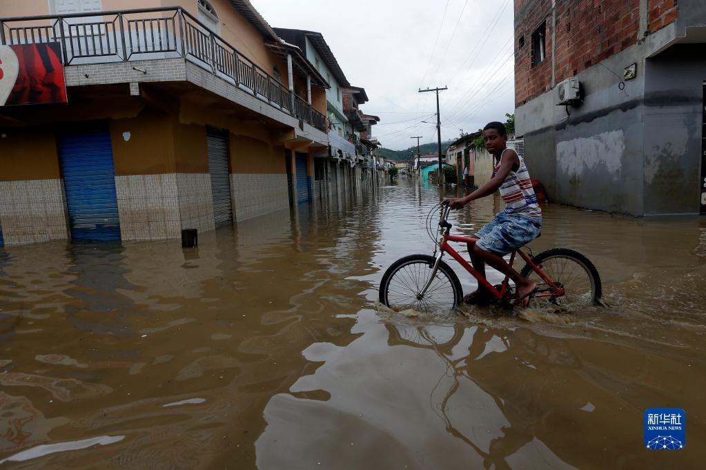 12月28日,一名男孩騎著(zhù)自行車(chē)在巴西巴伊亞州達里烏梅拉市被洪水淹沒(méi)的街道上出行。